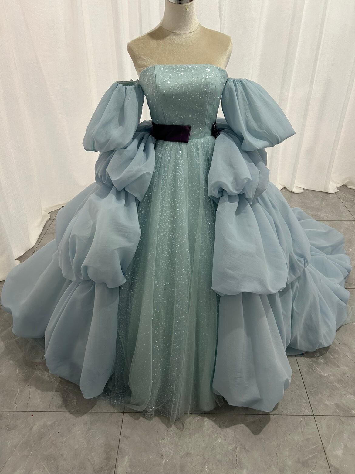 カラードレス 爽やかで優しいブルー 取り外し可能なトレーン シークインチュール 華やかなトレーン フレア袖 結婚式