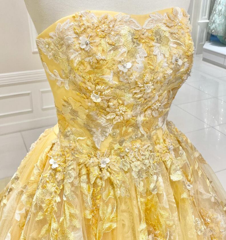 カラードレス パステルイエロー グラデーションドレス 花柄モチーフで刺繍が美しい 編み上げ アシンメトリー風 ビスチェドレス 花嫁