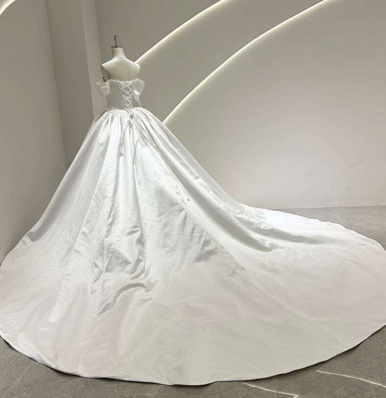 ウエディングドレス オフホワイト オフショルダー 編み上げ 韓国風ドレス 光沢サテン 華やかなトレーン 結婚式