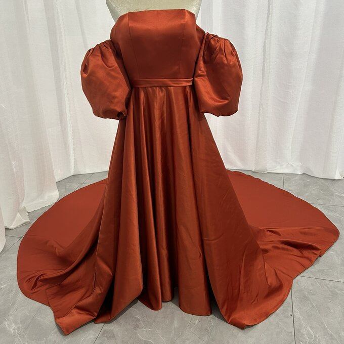 実例写真! カラードレス テラコッタ色 取り外し可能な付け袖 光沢サテン 華やかなトレーン 花嫁 前撮り