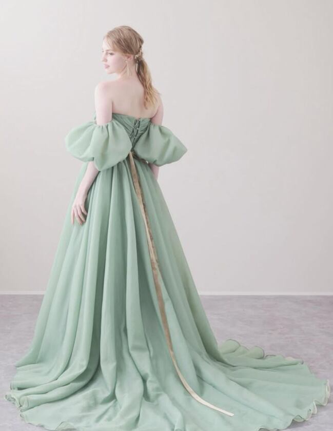 カラードレス ピスタチオグリーン 3WAYの着方 マット生地 取り外し可能な付け袖 サッシュベルト ロングトレーン 演奏会/音楽会 のコピー