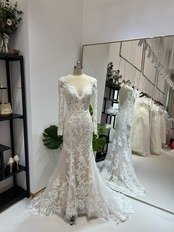 ウエディングドレス オフホワイト 韓国風ドレス 贅沢な総レース ロングスリーブ 2WAYの着方 結婚式