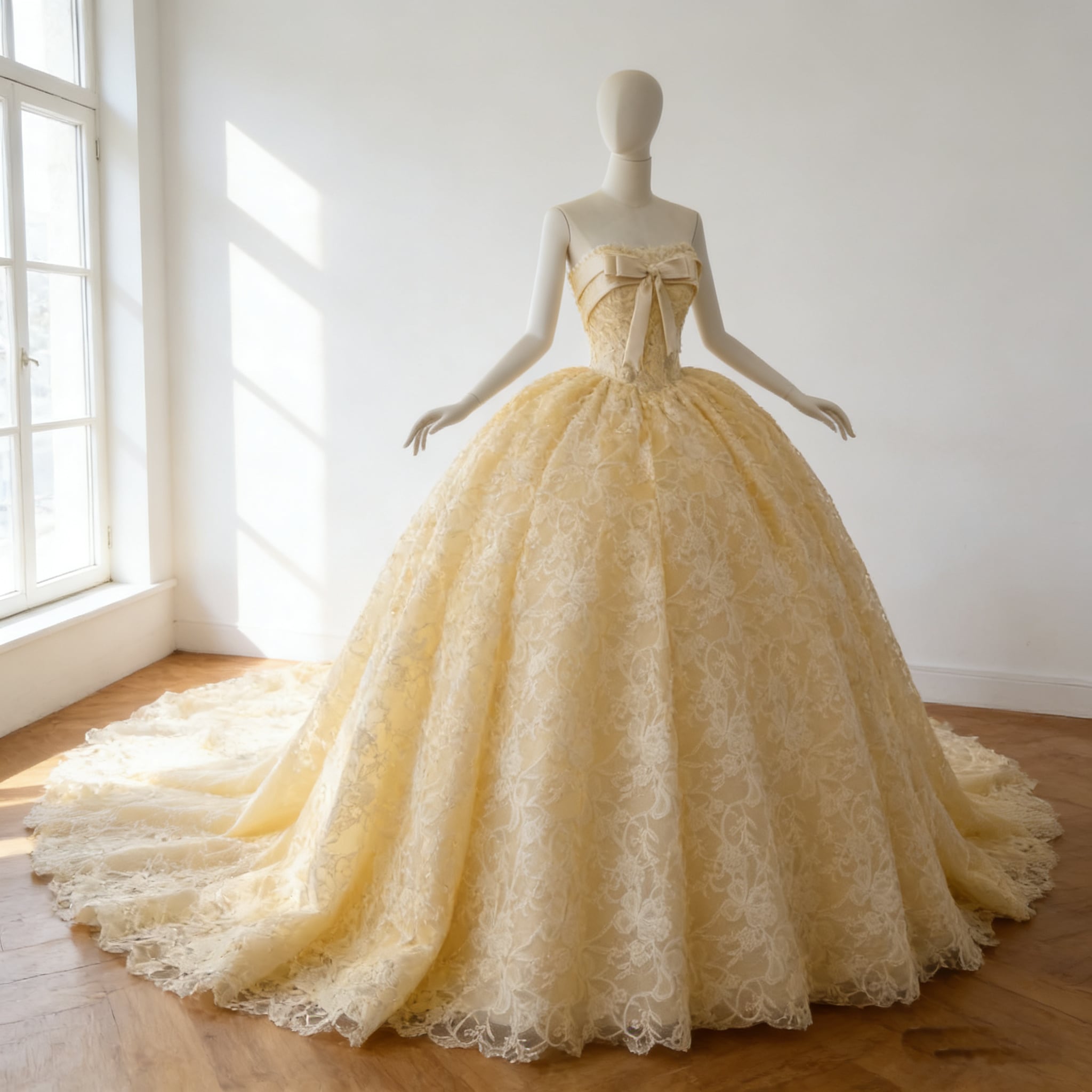 カラードレス パステルイエロー ビスチェドレス 贅沢な総レース 華やかなトレーン 憧れのドレス ブライダル
