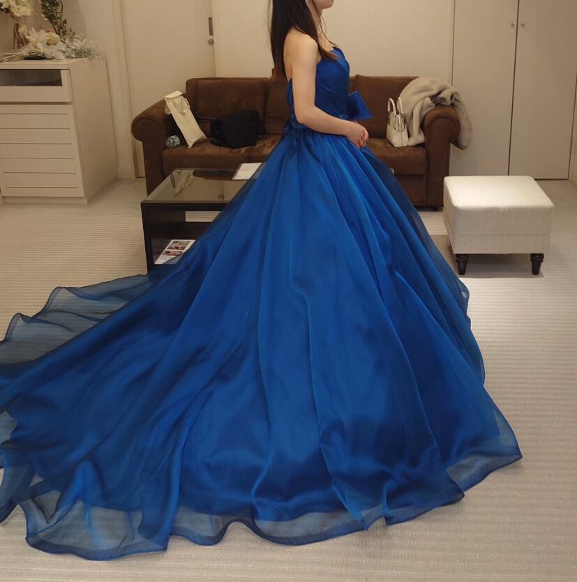カラードレス 上質オーガンジー ジュエルネイビー リボン 編み上げ 華やかなトレーン ビスチェドレス 花嫁 演奏会/音楽会