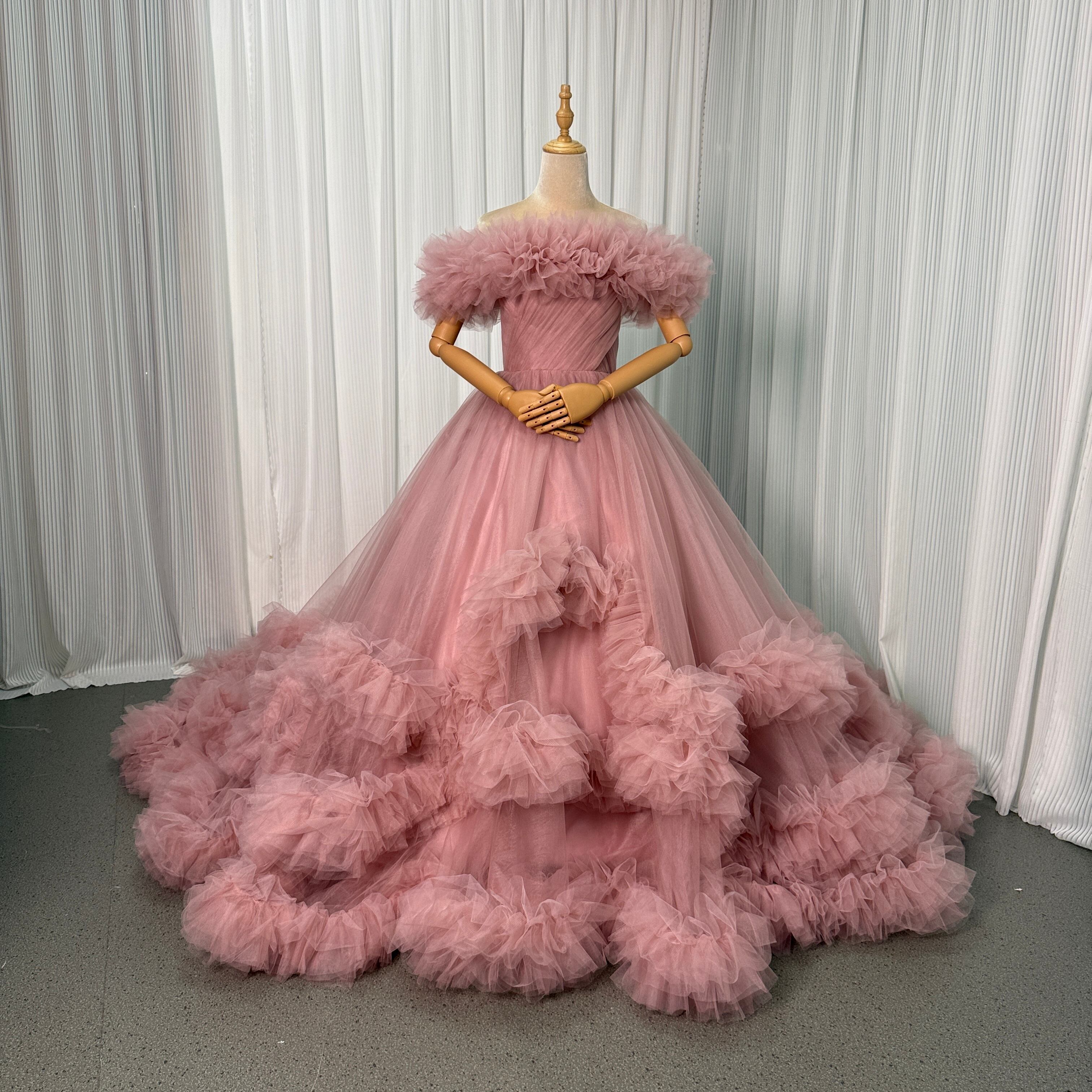 カラードレス ピンク 取り外し可能なオフショルダー ボリュームドレス ソフトチュール 華やかなトレーン 披露宴/結婚式
