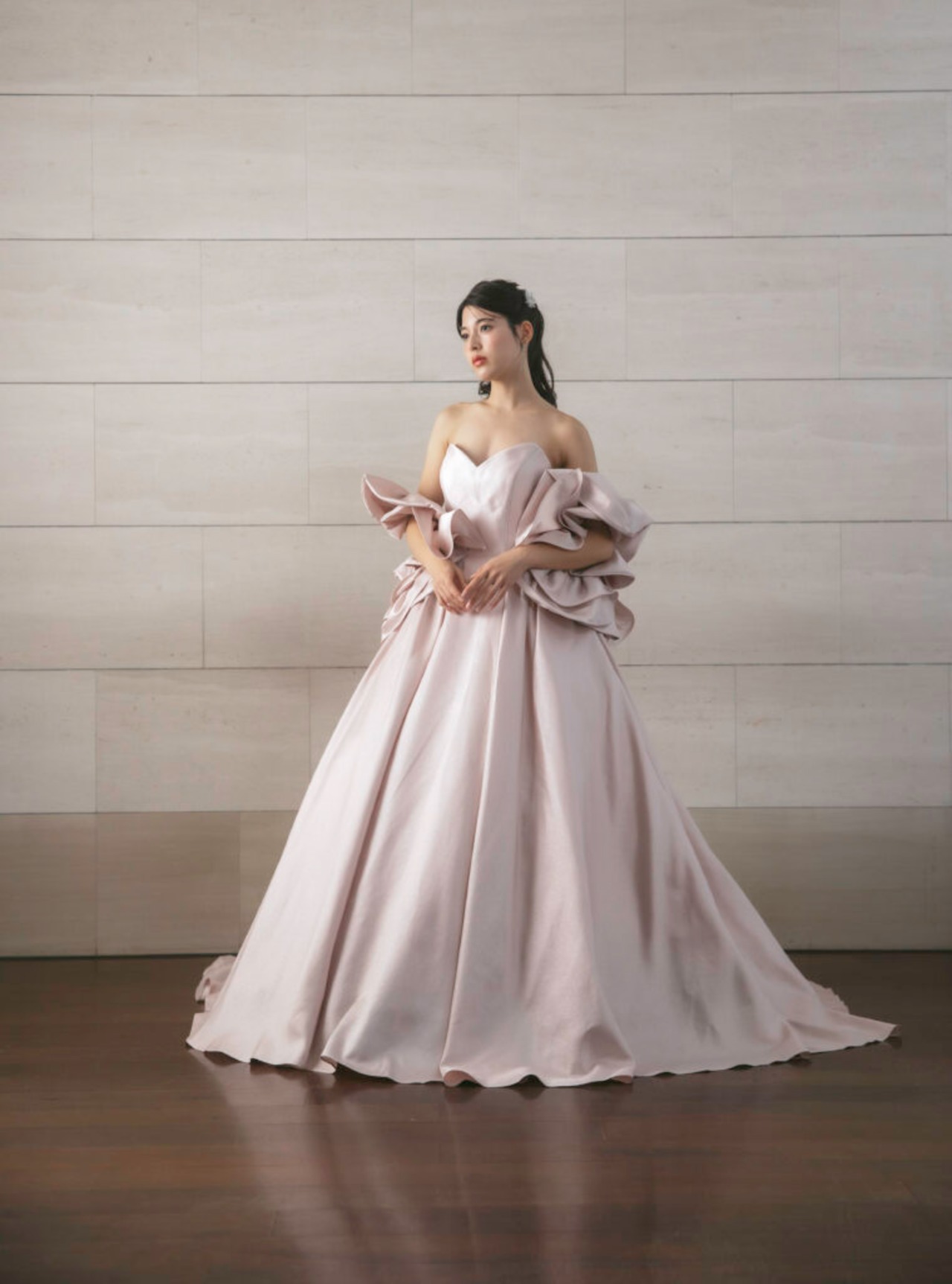 カラードレス ピンク 取り外し可能な付け袖 光沢サテン 華やかなトレーン 色直し 花嫁