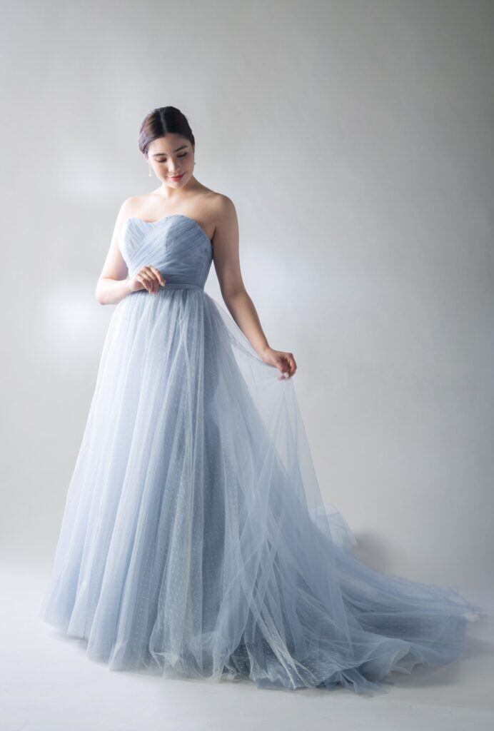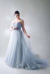 カラードレス 爽やかで優しいブルー 編み上げ ソフトチュール 細見えシルエット ソフトマーメイドライン 花嫁 前撮り