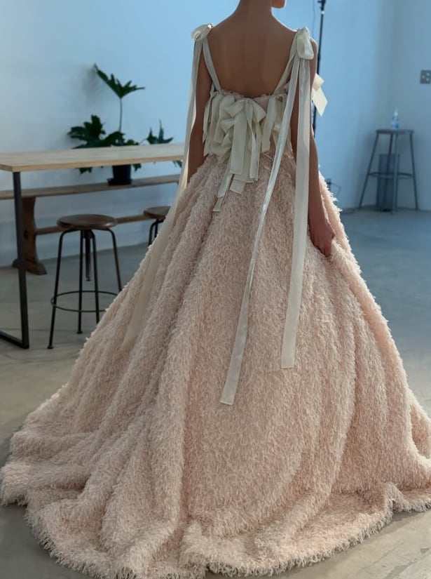 カラードレス ピンク キャミソール もこもこドレス 華やかなトレーン 編み上げ アシンメトリー風 結婚式