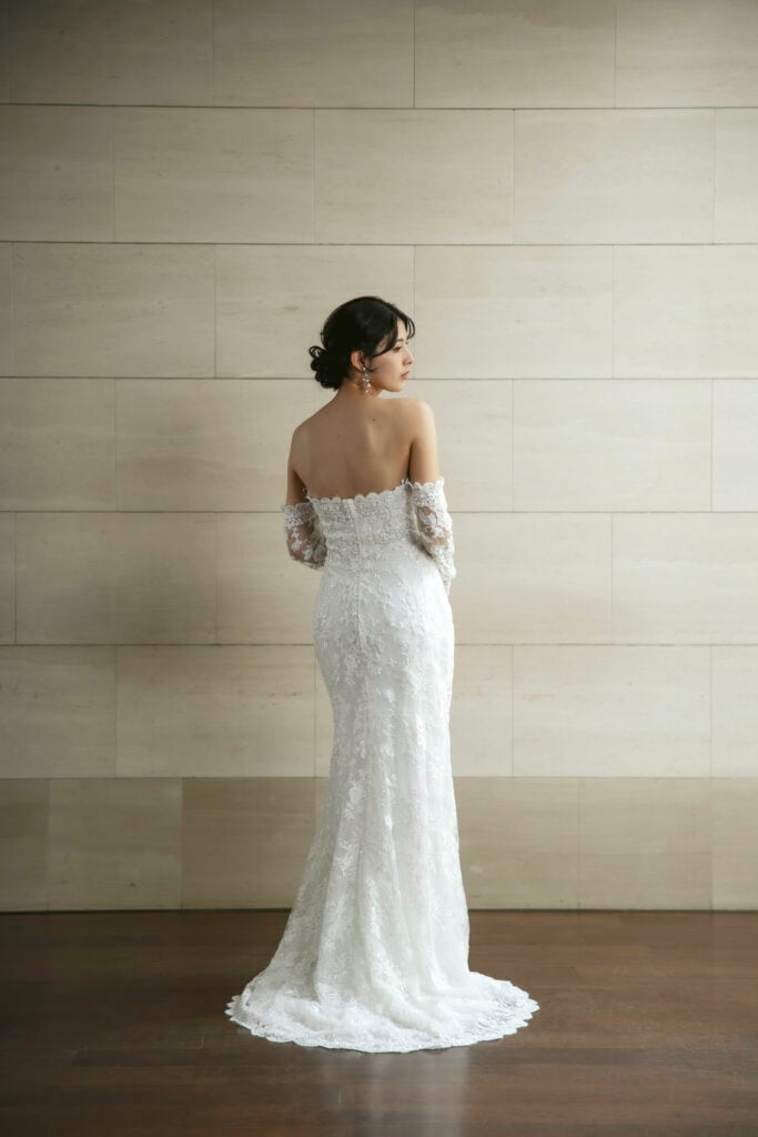 ウエディングドレス オフホワイト 取り外し可能な付け袖 贅沢な総レース ソフトマーメイドライン 細見えシルエット 短トレーン 結婚式