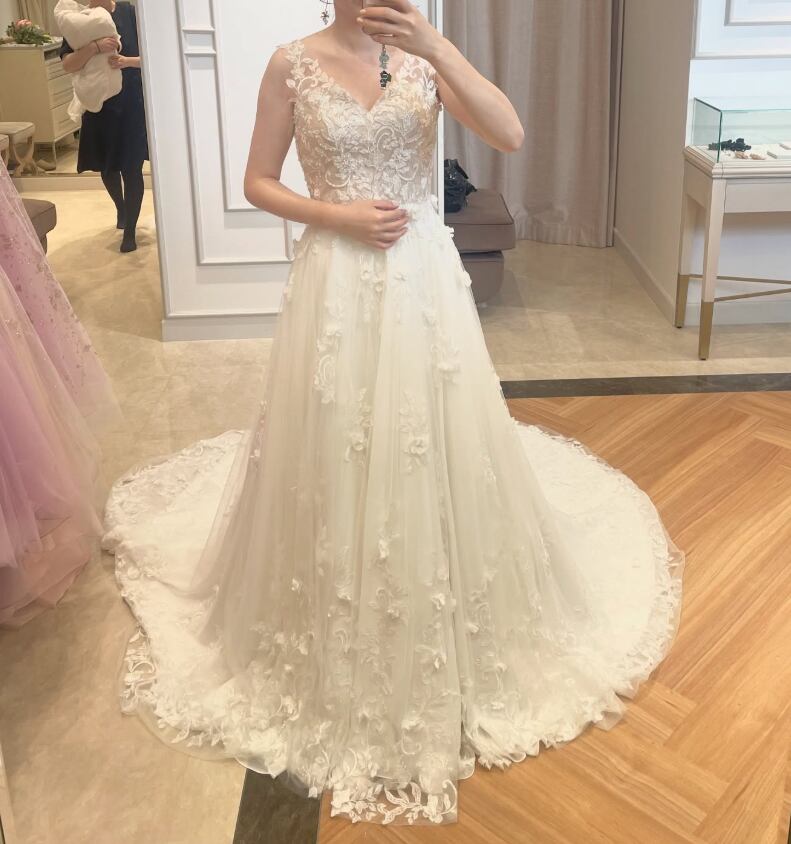 ウエディングドレス オフホワイト キャミソール ファスナー 3D立体レース刺繍 ロングトレーン Vネックドレス 結婚式 前撮り