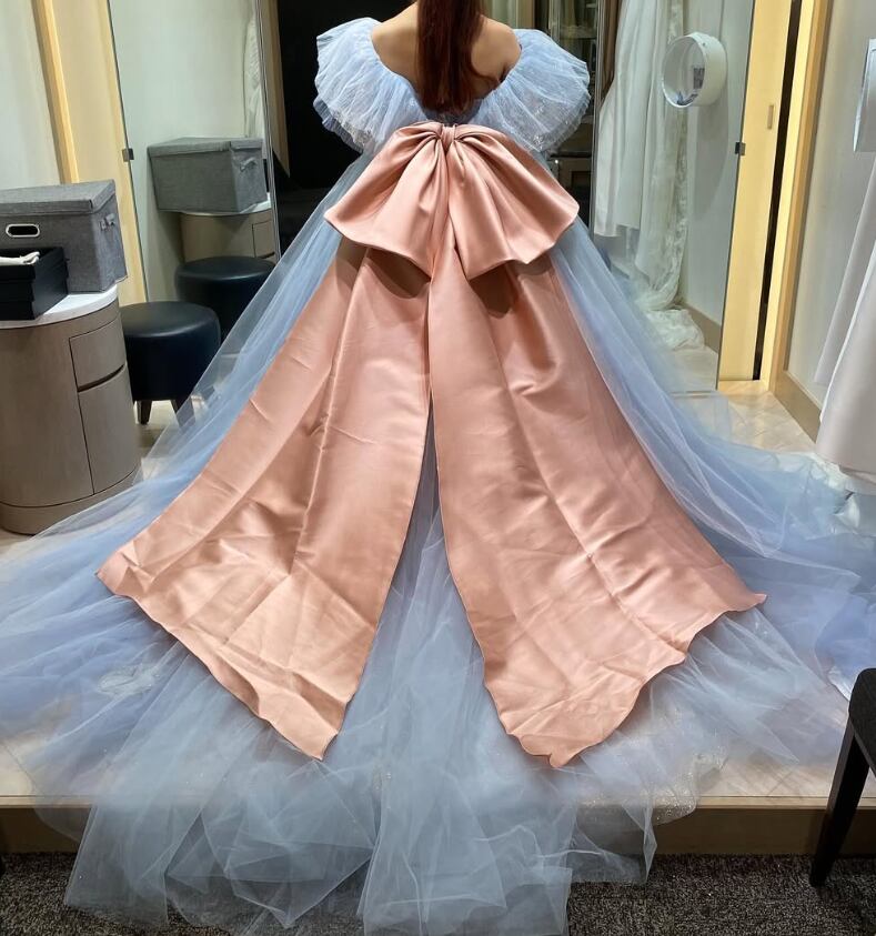カラードレス 爽やかで優しいブルー シークインチュール ふっくら柔らかなバックリボン オフショルダー 華やかなトレーン 結婚式