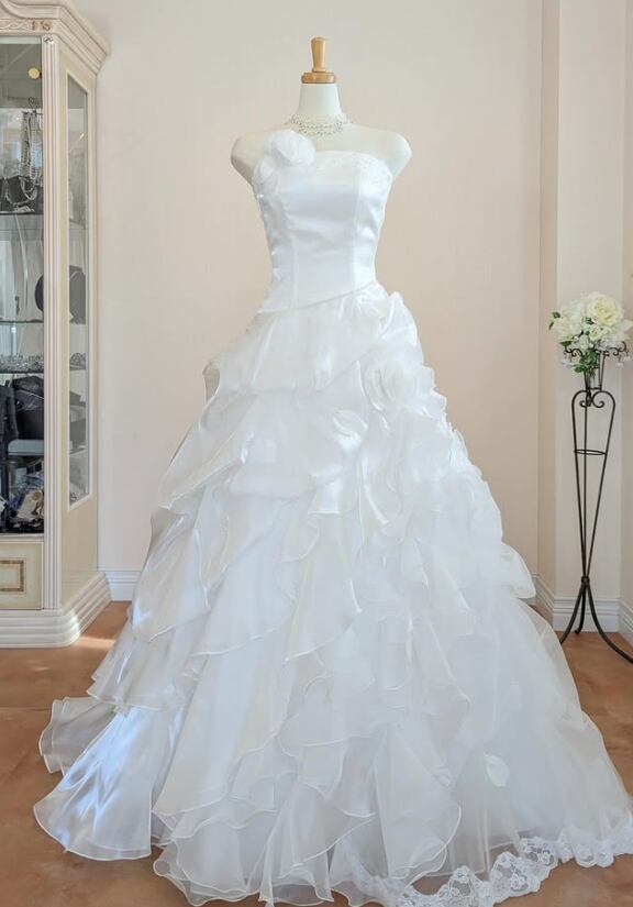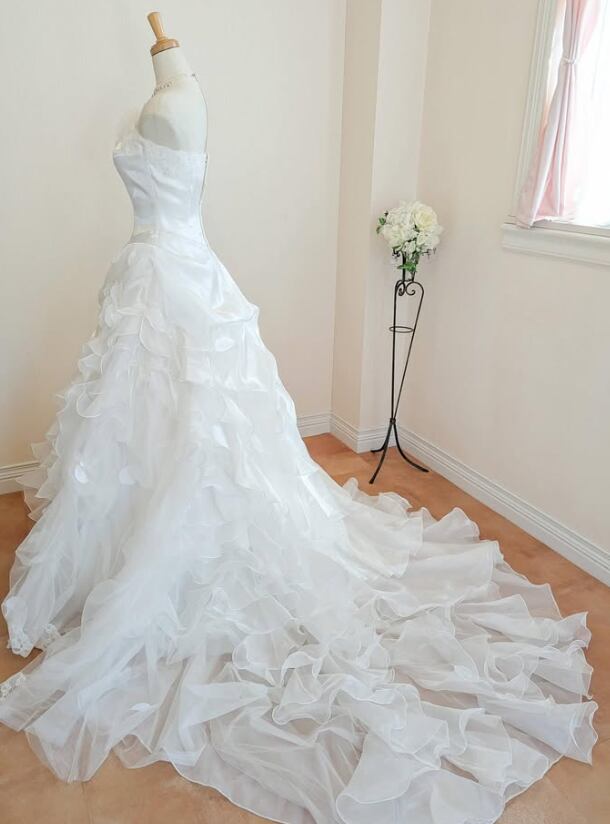 ウエディングドレス オフホワイト 上質オーガンジー 華やかなトレーン アシンメトリー風 ビスチェドレス 結婚式