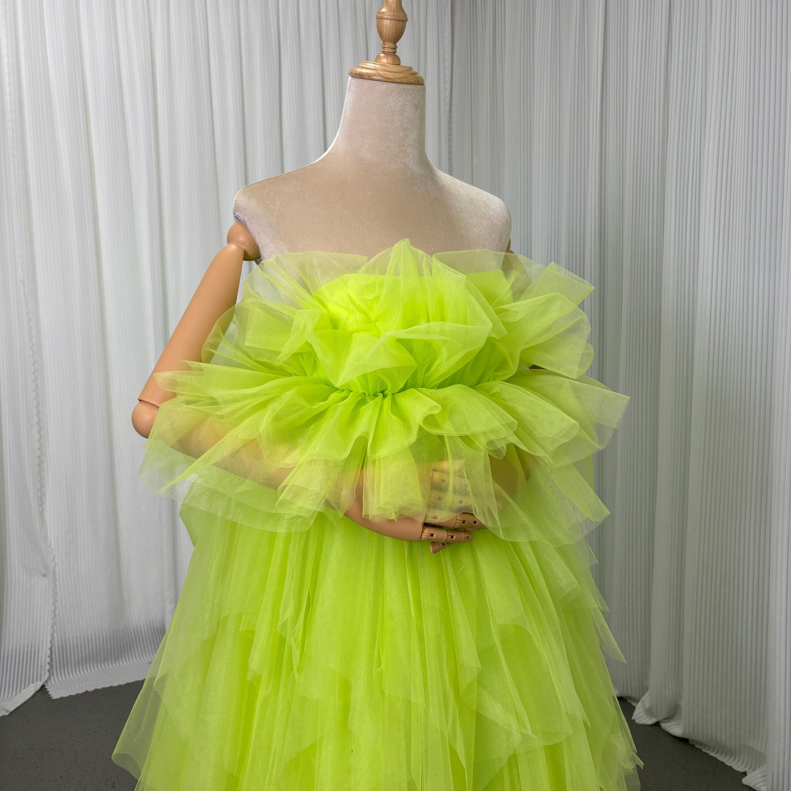 カラードレス グリーン 取り外し可能な付け袖 アシンメトリードレス ソフトチュール 短トレーン結婚式 前撮り