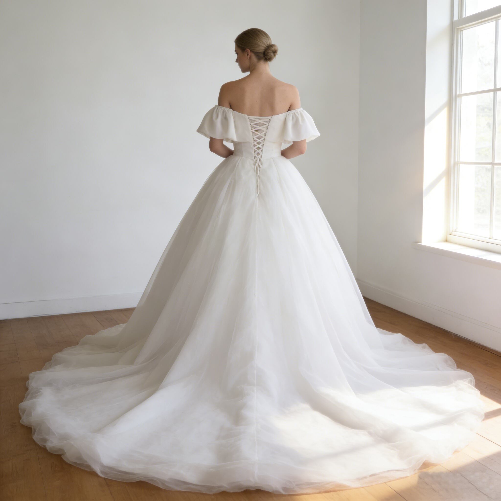 ウエディングドレス オフホワイト オフショルダー 編み上げ ソフトチュール 華やかなトレーン 結婚式