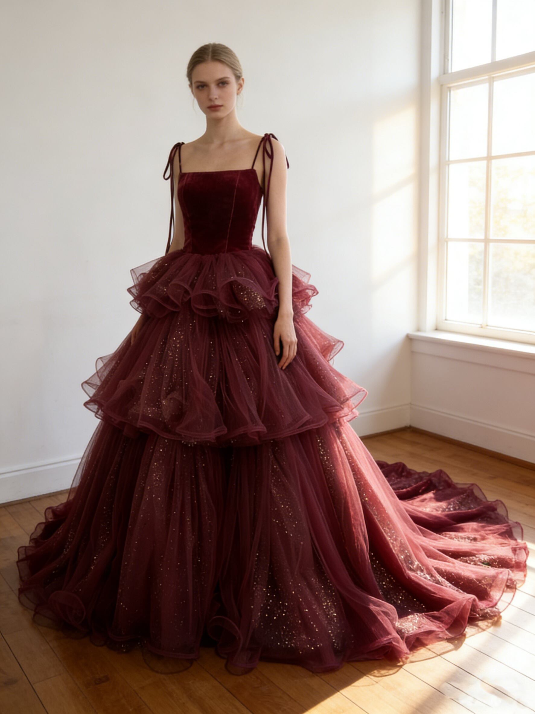 カラードレス ボルドー色 キャミソール 編み上げ シークインチュール 華やかなトレーン 結婚式