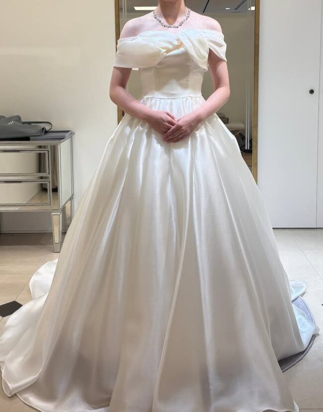 ウエディングドレス オフホワイト オフショルダー 上質オーガンジー アンティークなドレス ロングトレーン 結婚式