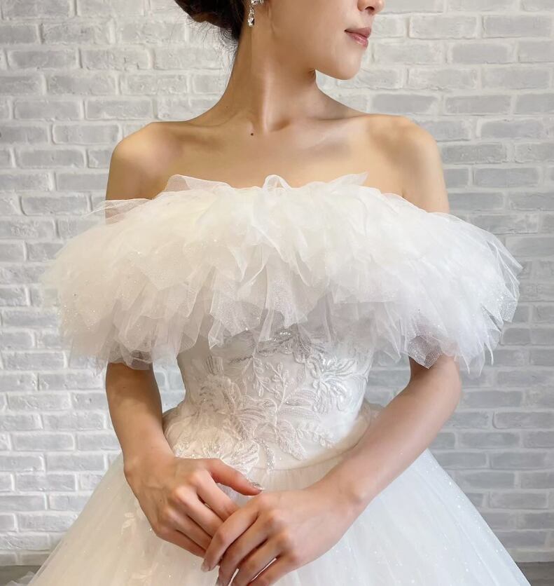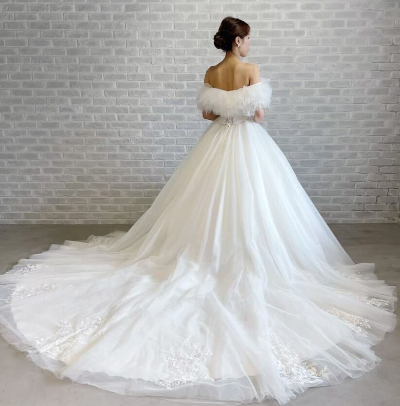 ウエディングドレス オフホワイト オフショルダー 花柄モチーフで刺繍が美しい ソフトチュール 編み上げ 華やかなトレーン 結婚式