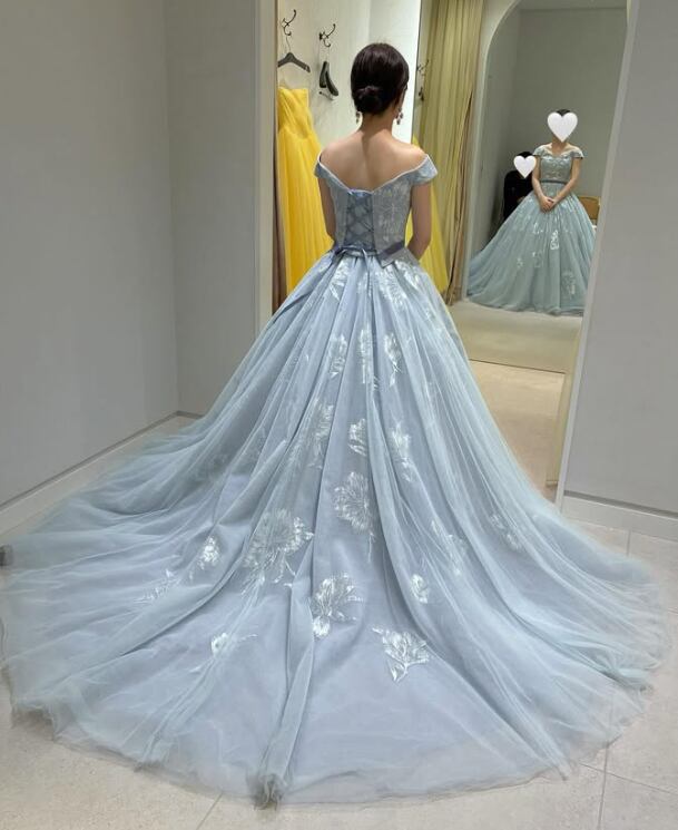 カラードレス 爽やかで優しいブルー オフショルダー 編み上げ 花柄モチーフで刺繍が美しい 華やかなトレーン 花嫁