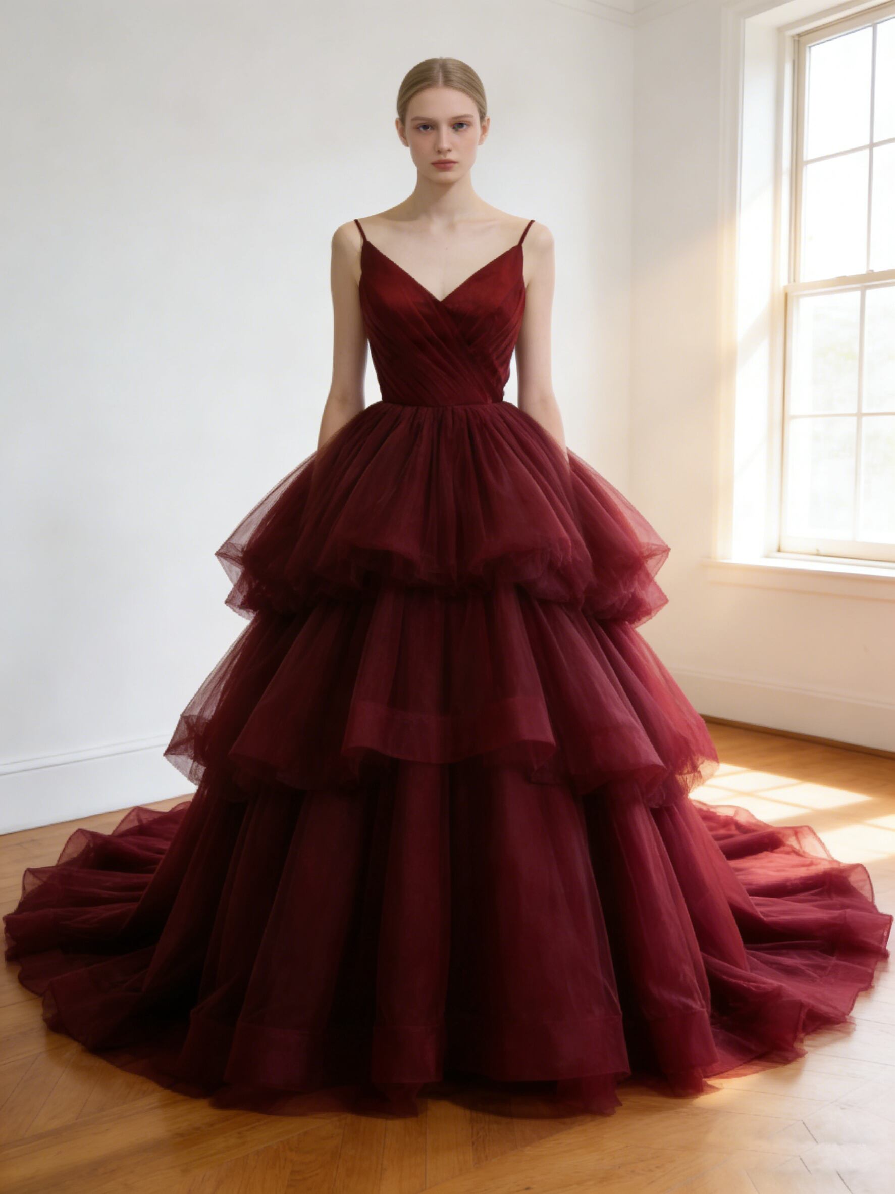 カラードレス ボルドー色 キャミソール ソフトチュール 華やかなトレーン 結婚式 前撮り