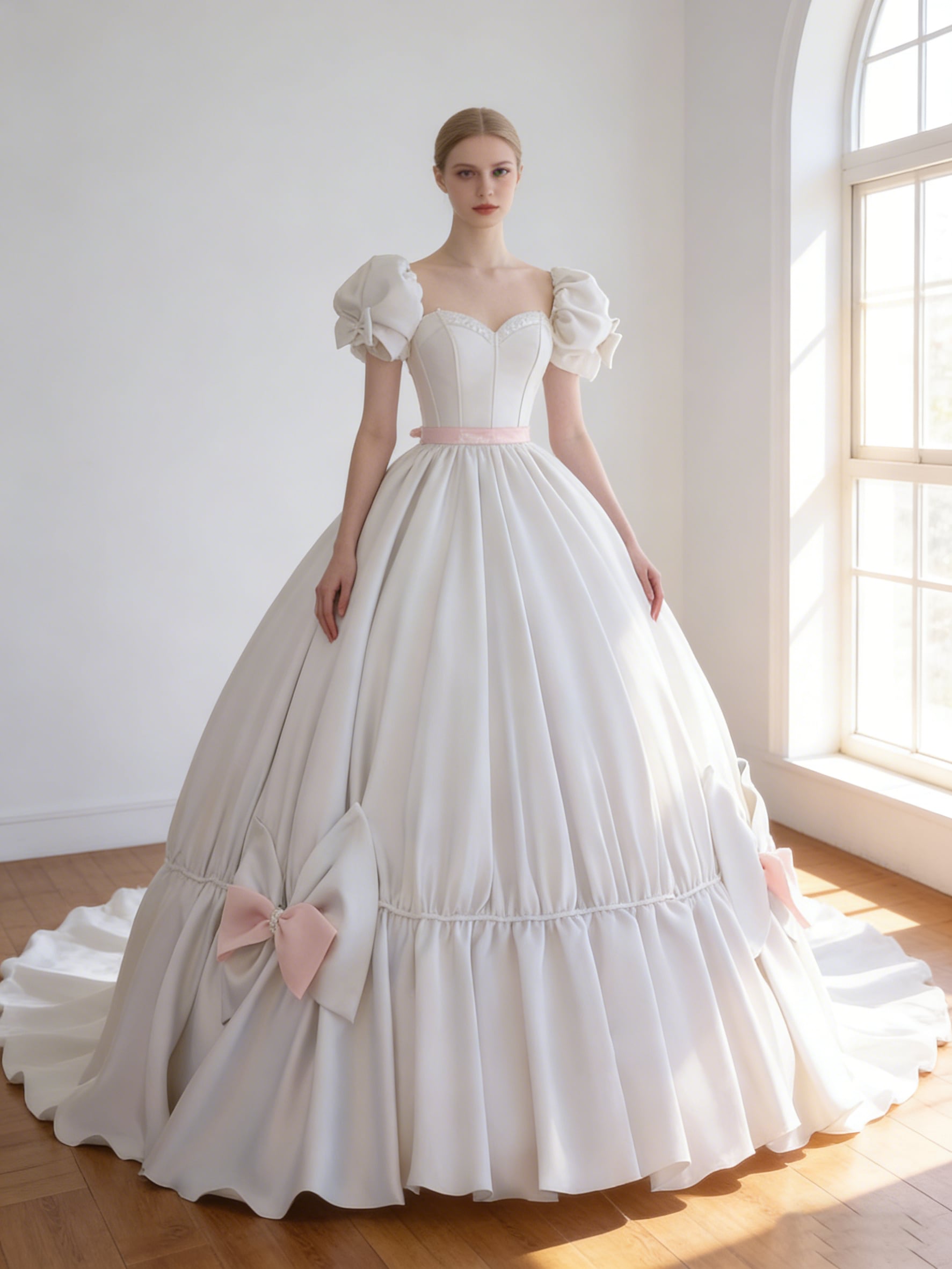 ウエディングドレス オフホワイト プリンセスライン 姫袖 リボン 華やかなトレーン ブライダル