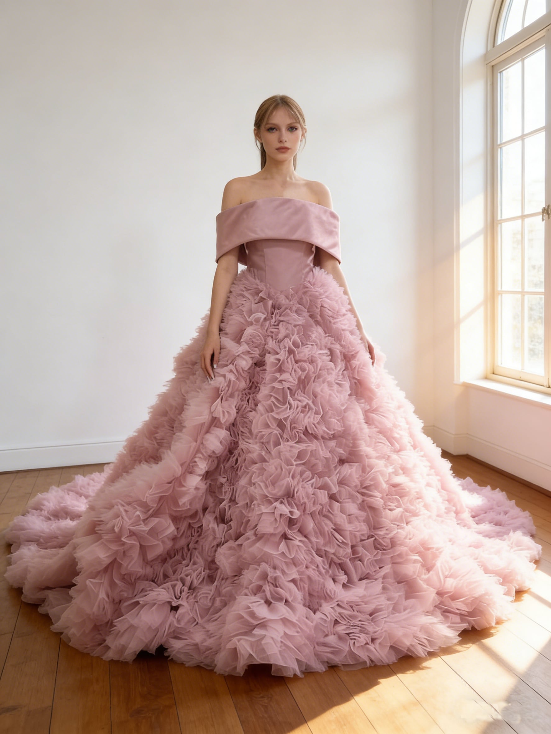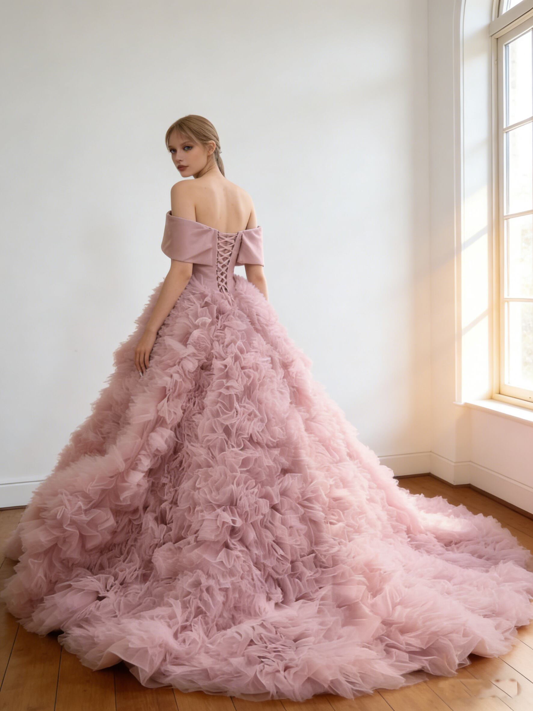 カラードレス ピンク オフショルダー ボリュームドレス 編み上げ 華やかなトレーン 結婚式 前撮り