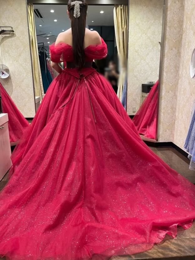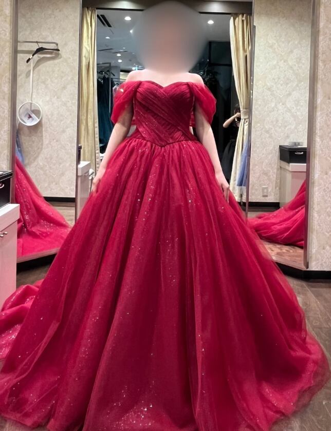 カラードレス えんじ色 サッシュベルト オフショルダー ロングトレーン 花嫁 前撮り