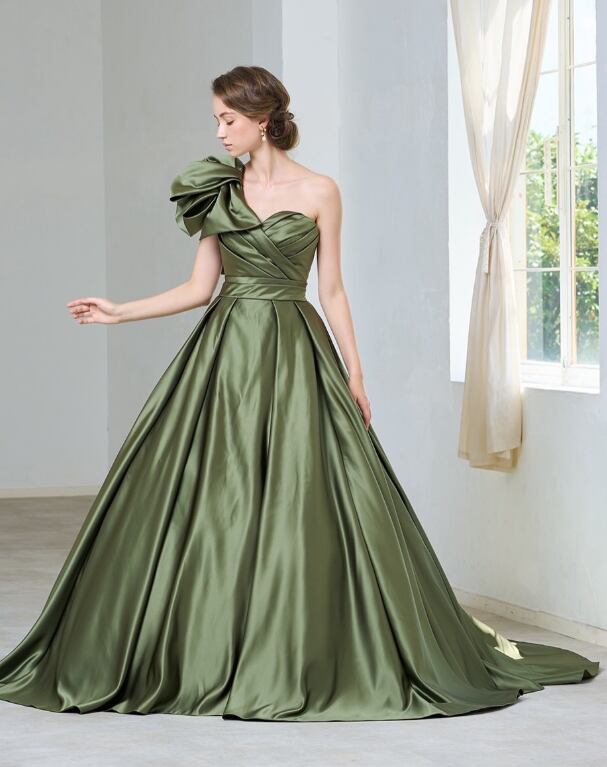 カラードレス 深緑 ショルダー型 光沢サテン 華やかなトレーン くるみボタン スリット 花嫁 前撮り