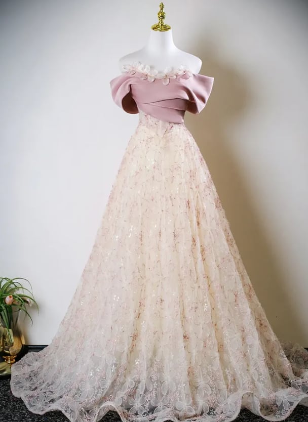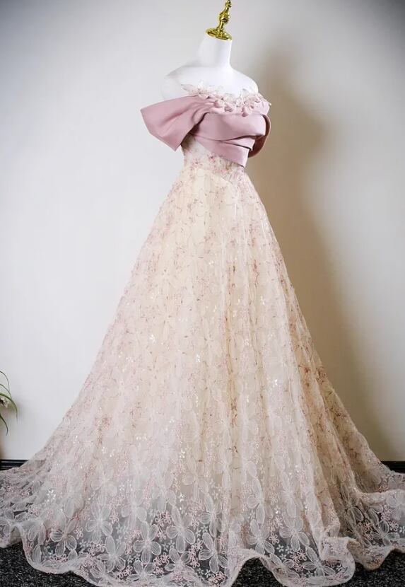 カラードレス 贅沢な総レース ピンク 3D立体レース刺繍 オフショルダー 花嫁 前撮り