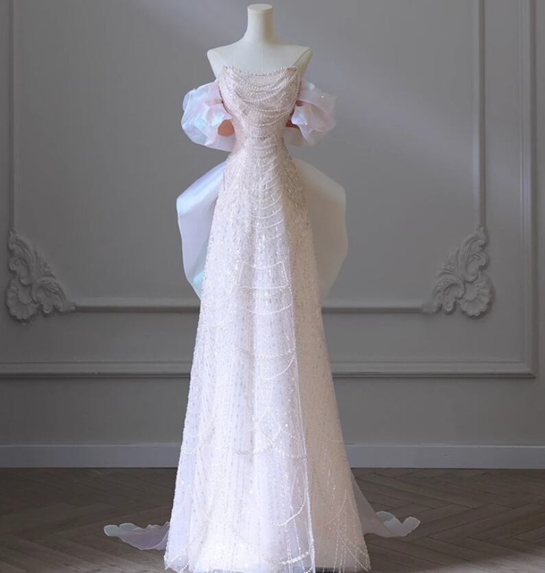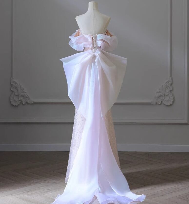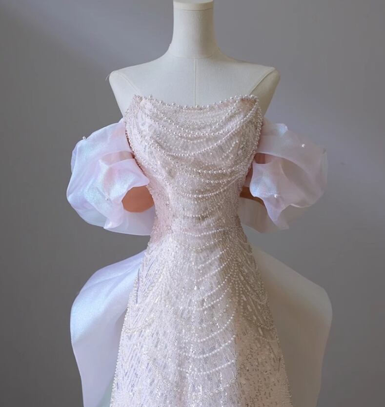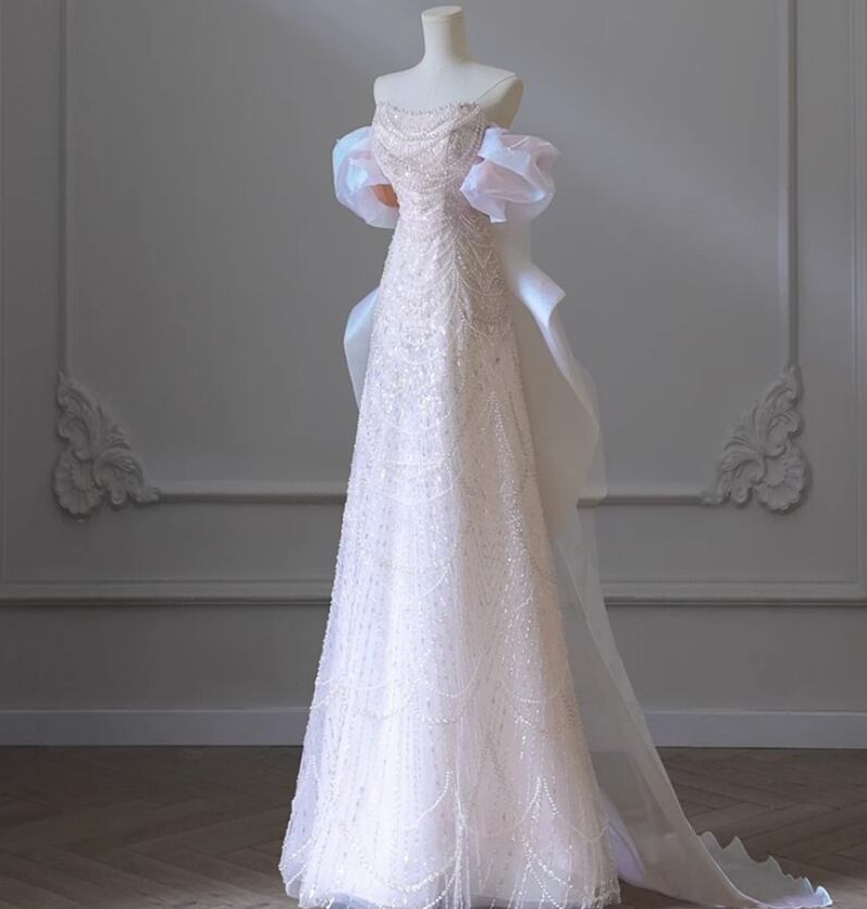 ウエディングドレス オフショルダー パール オフホワイト 細見えシルエット 韓国風ドレス 披露宴/結婚式