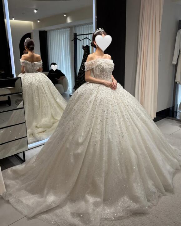 ウエディングドレス オフホワイト オフショルダー 韓国風ドレス シークインチュール 編み上げ 華やかなトレーン ブライダル