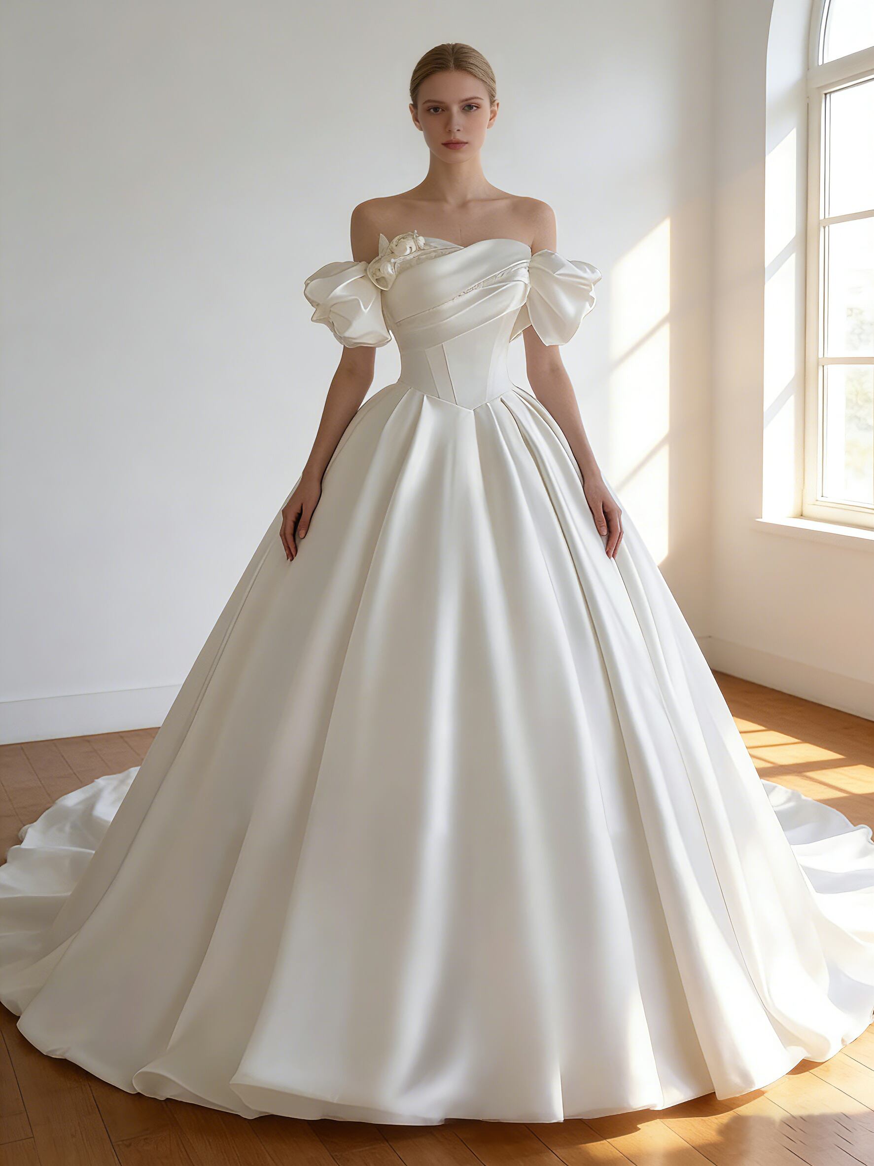 ウエディングドレス オフホワイト オフショルダー スリット 光沢サテン 華やかなトレーン 結婚式