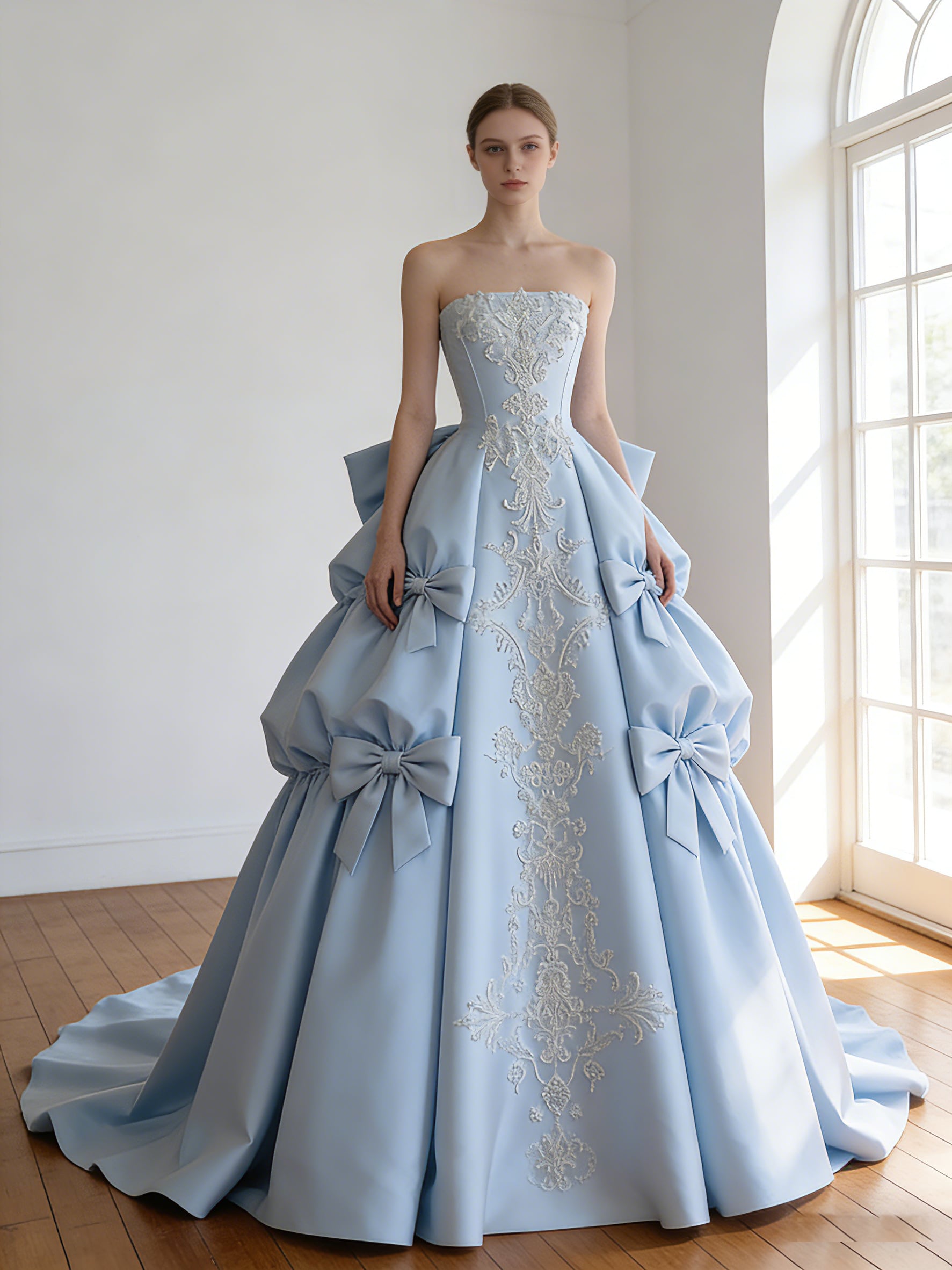 カラードレス 爽やかで優しいブルー リボン 繊細なレース 華やかなトレーン ビスチェドレス 演奏会/音楽会