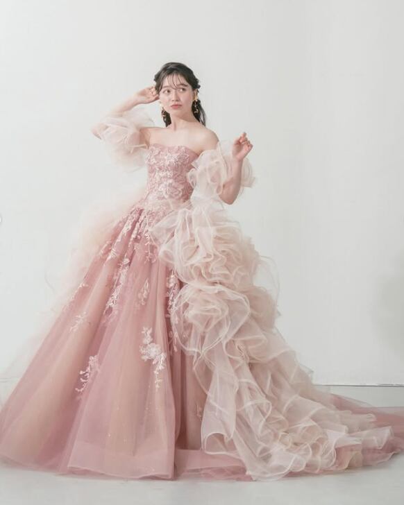 カラードレス ピンク 取り外し可能な付け袖 繊細なレース 華やかなトレーン 可愛い 結婚式 前撮り