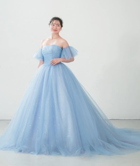 カラードレス 爽やかで優しいブルー シークインチュール ソフトチュール フリル袖 華やかなトレーン 結婚式