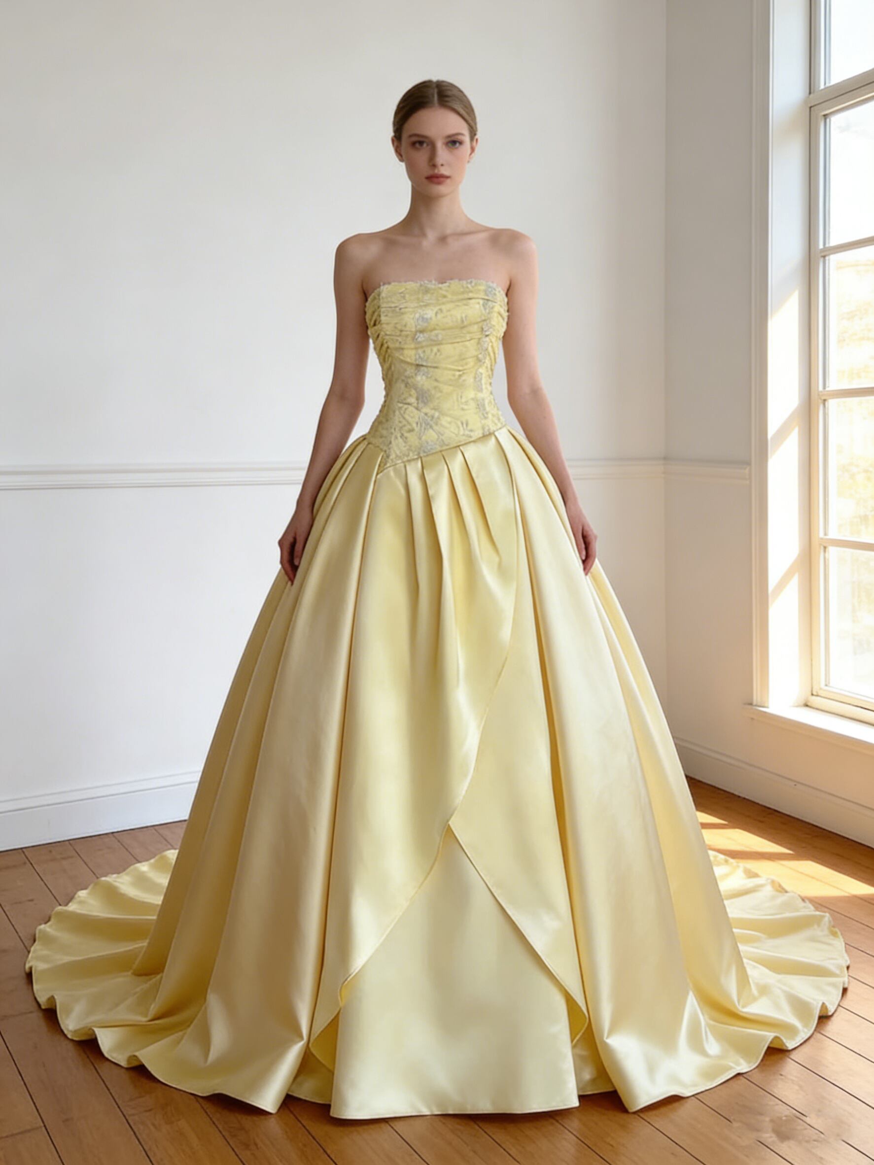 カラードレス パステルイエロー 光沢サテン ビスチェドレス 華やかなトレーン 花嫁 前撮り
