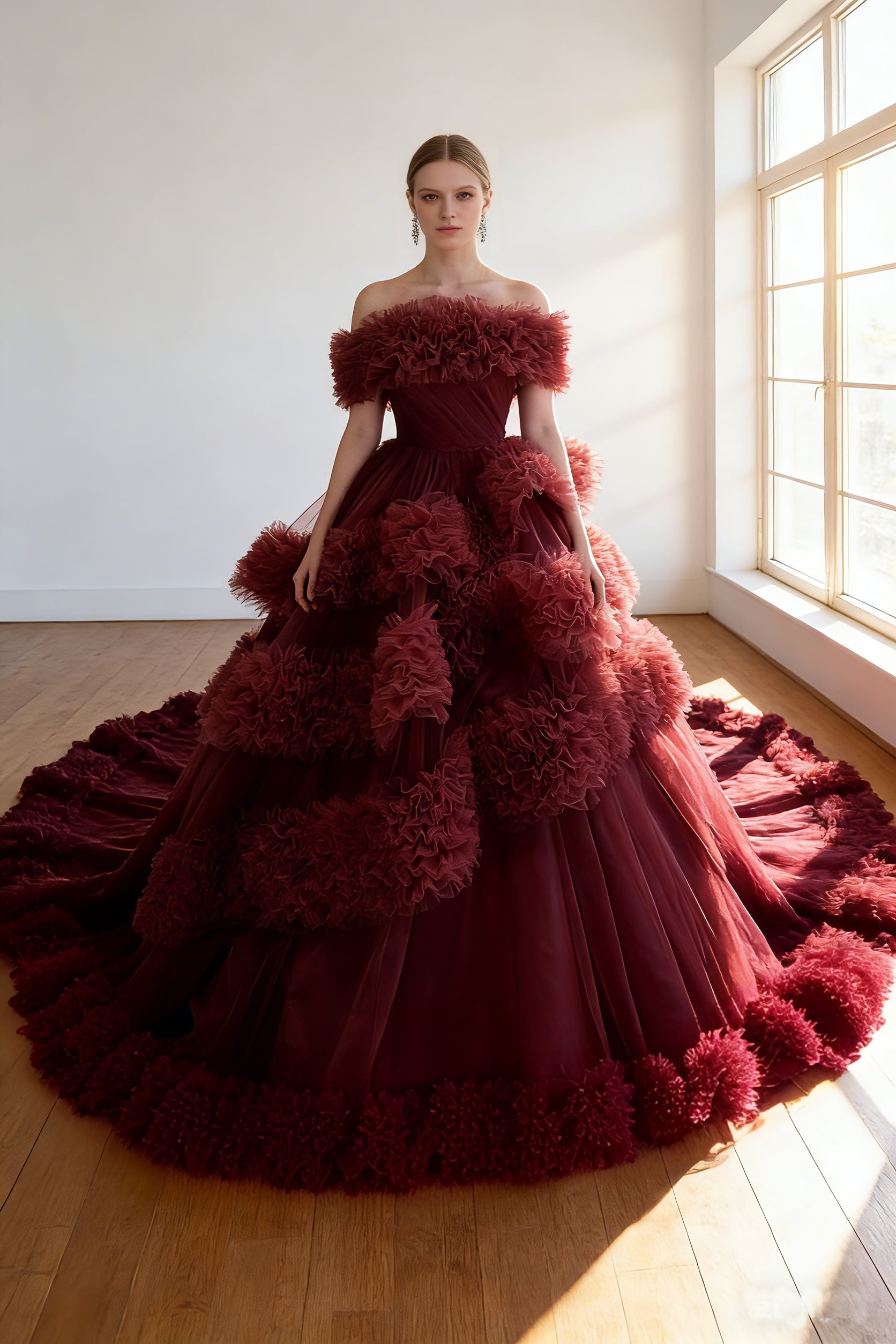 カラードレス ボルドー色 オフショルダー もこもこドレス ボリュームドレス 華やかなトレーン 披露宴/結婚式
