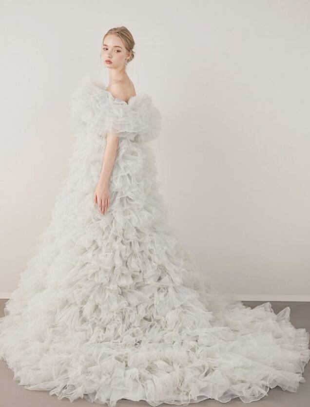 カラードレス グレー オフショルダー もこもこドレス 柔らかく重ねたチュールスカート ロングトレーン 花嫁