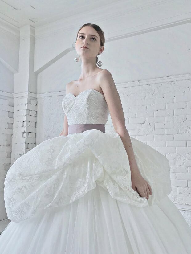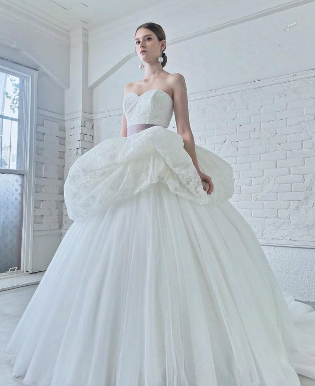 ウエディングドレス オフホワイト サッシュベルト 編み上げ レイヤードドレス 華やかなトレーン ビスチェドレス ブライダル