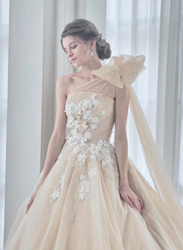 カラードレス あんず色 ショルダー型 花柄モチーフで刺繍が美しい シークインチュール 華やかなトレーン 結婚式 演奏会