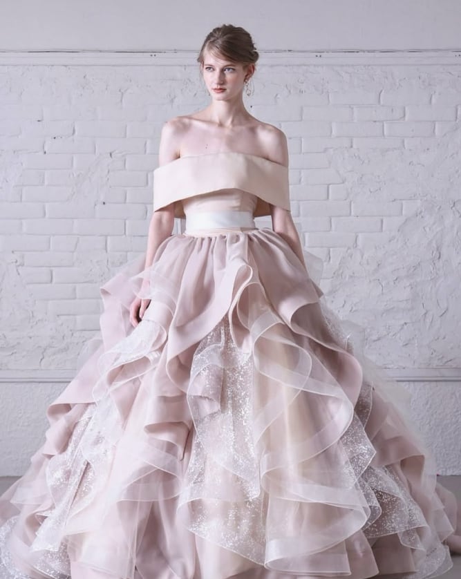 カラードレス あんず色 シークインチュール ラッフルフリル 華やかなトレーン 取り外し可能なオフショルダー ブライダル 憧れのドレス 結婚式