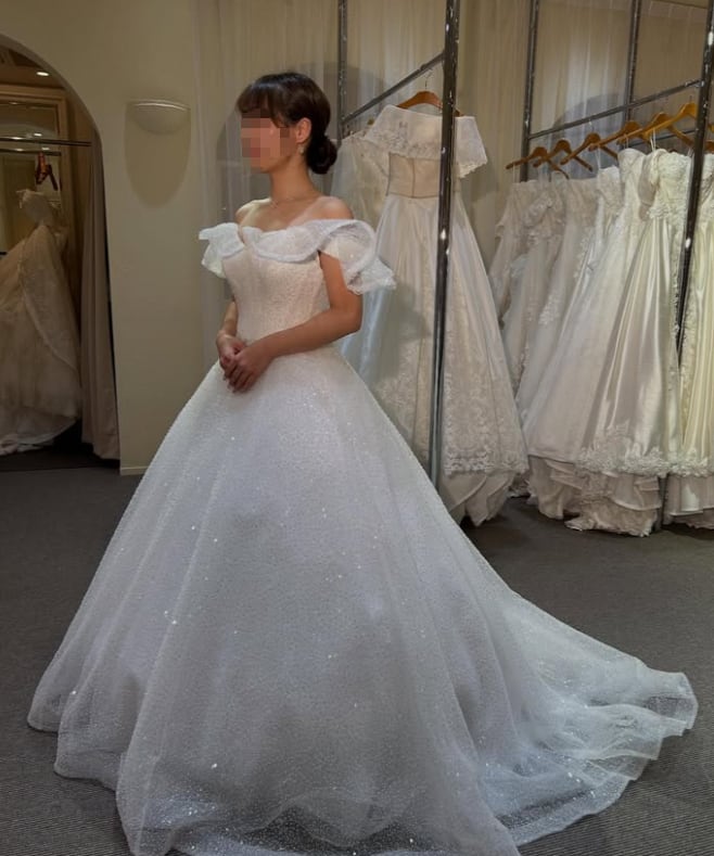 ウエディングドレス オフホワイト オフショルダー 韓国風ドレス シークインチュール 華やかなトレーン 憧れのドレス 結婚式