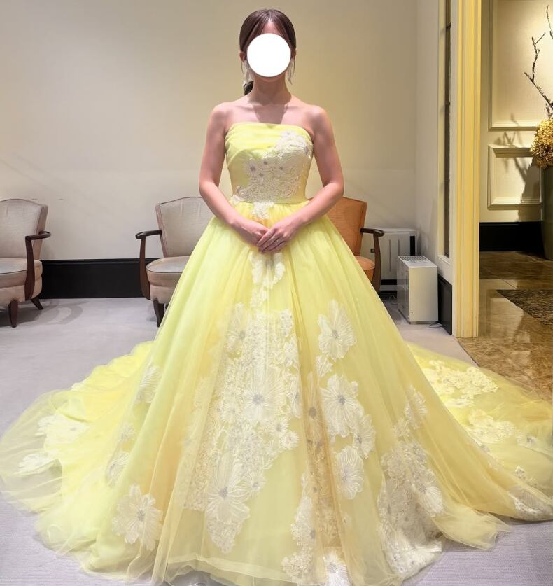 カラードレス パステルイエロー 花柄モチーフで刺繍が美しい ビスチェドレス 華やかなトレーン 目立つ 結婚式