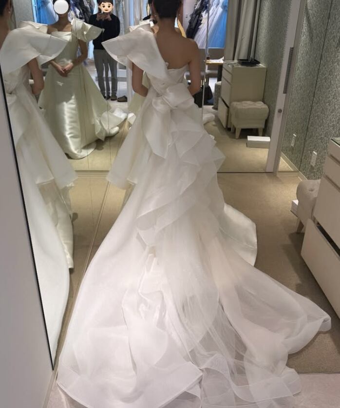 ウエディングドレス オフホワイト ショルダー型 シークインチュール ソフトマーメイドライン 華やかなトレーン 結婚式