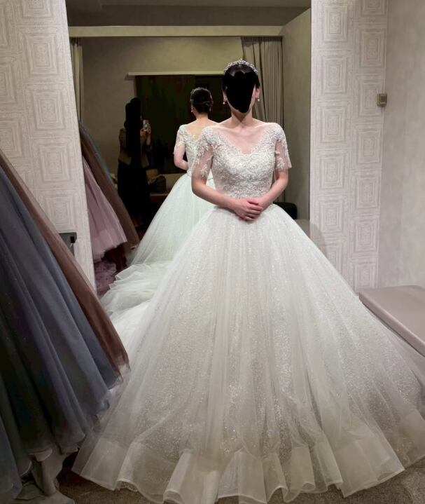 ウエディングドレス オフホワイト シークインチュール 韓国風ドレス 華やかなトレーン 目立つ 華やか! ブライダル 憧れのドレス