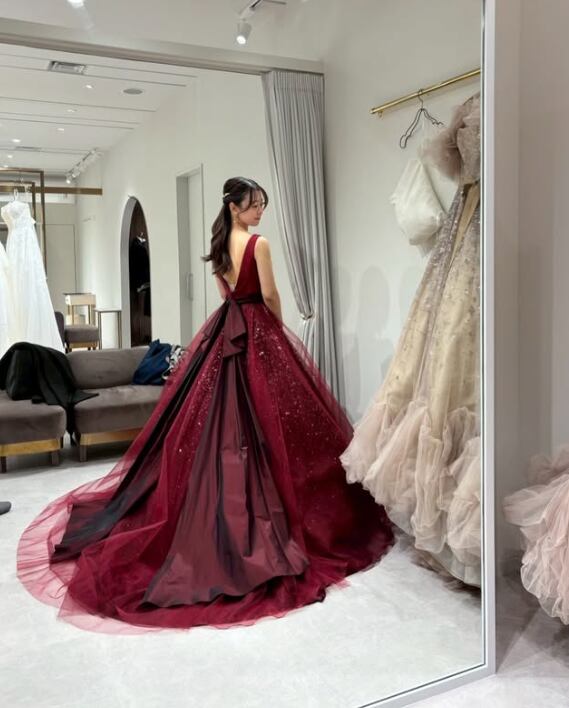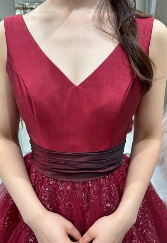 カラードレス ボルドー色 ふっくら柔らかなバックリボン シークインチュール 華やかなトレーン Vネックドレス 結婚式