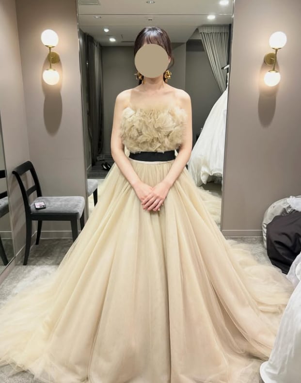 カラードレス シャンパン色 サッシュベルト ビスチェドレス ソフトチュール 披露宴/結婚式