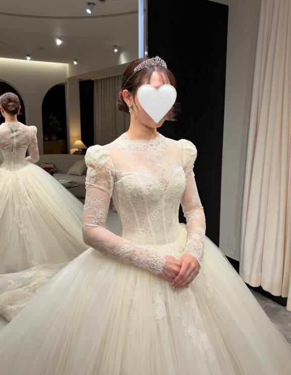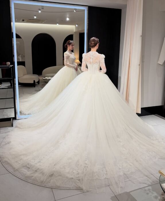 ウエディングドレス オフホワイト 繊細なレース ロングスリーブ 韓国風ドレス 華やかなトレーン ブライダル