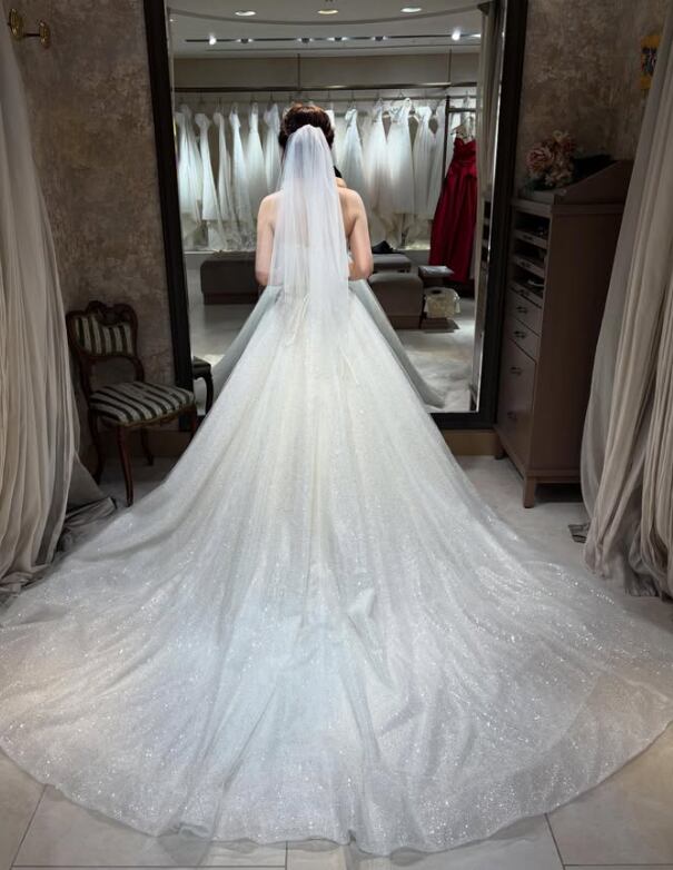 ウエディングドレス オフホワイト シークインチュール ロングベール 華やかなトレーン 憧れのドレス ビスチェドレス 韓国風ドレス 結婚式