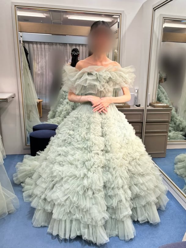 カラードレス グリーン オフショルダー もこもこドレス ソフトチュール 華やかなトレーン 結婚式