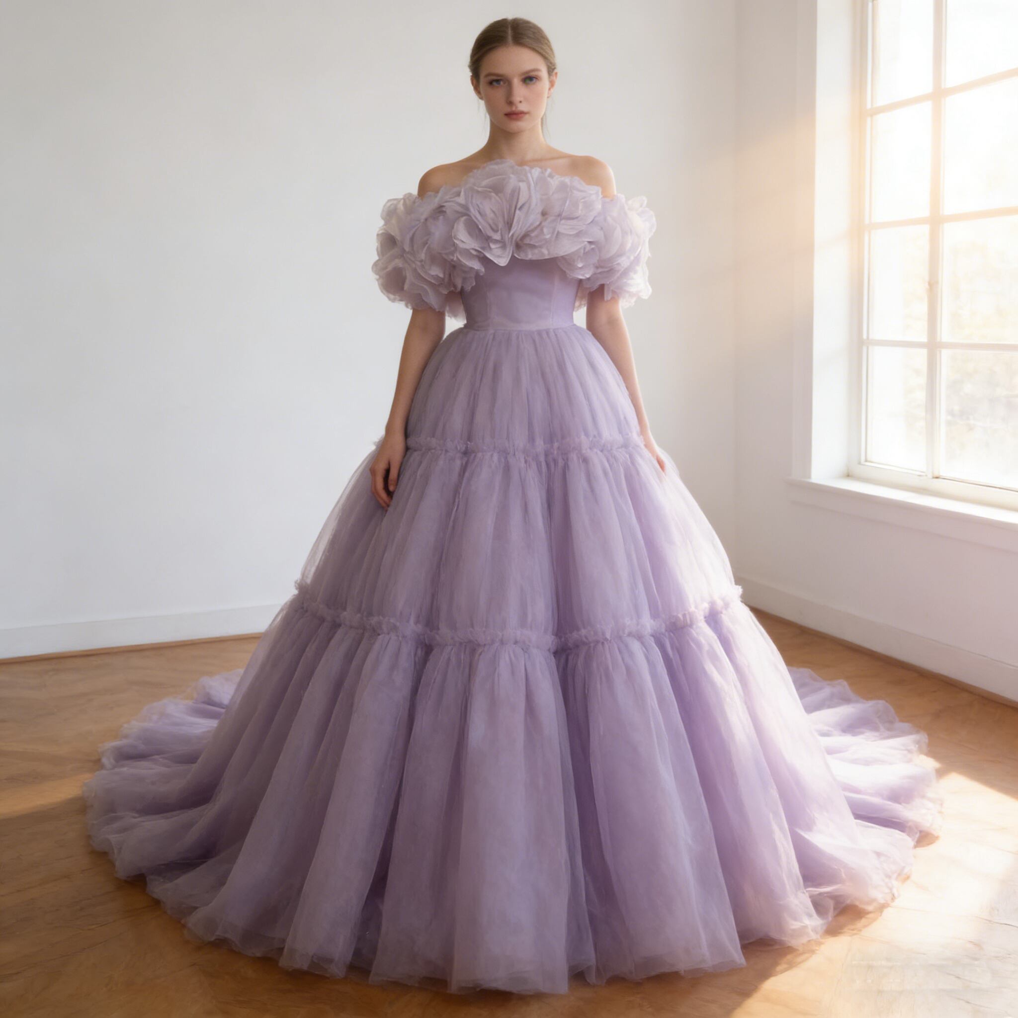 カラードレス オーキッド フリルオフショルダー 華やかなトレーン ソフトチュール 披露宴/結婚式